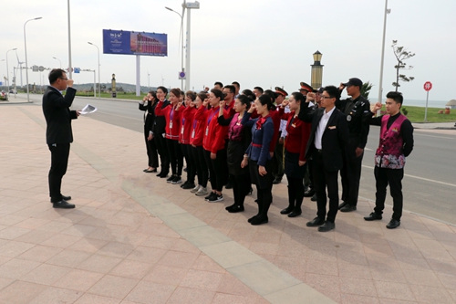 本次活动共有近30人参加,在集体重温入团誓词后,志愿服务活动正式开始。大家自动组成小分队,相互配合,分别帮助沙滩工作人员清洁沙滩、草坪,并免费为正在工作的清洁工人、景区里的值岗员工送上矿泉水,传递关爱和温暖。